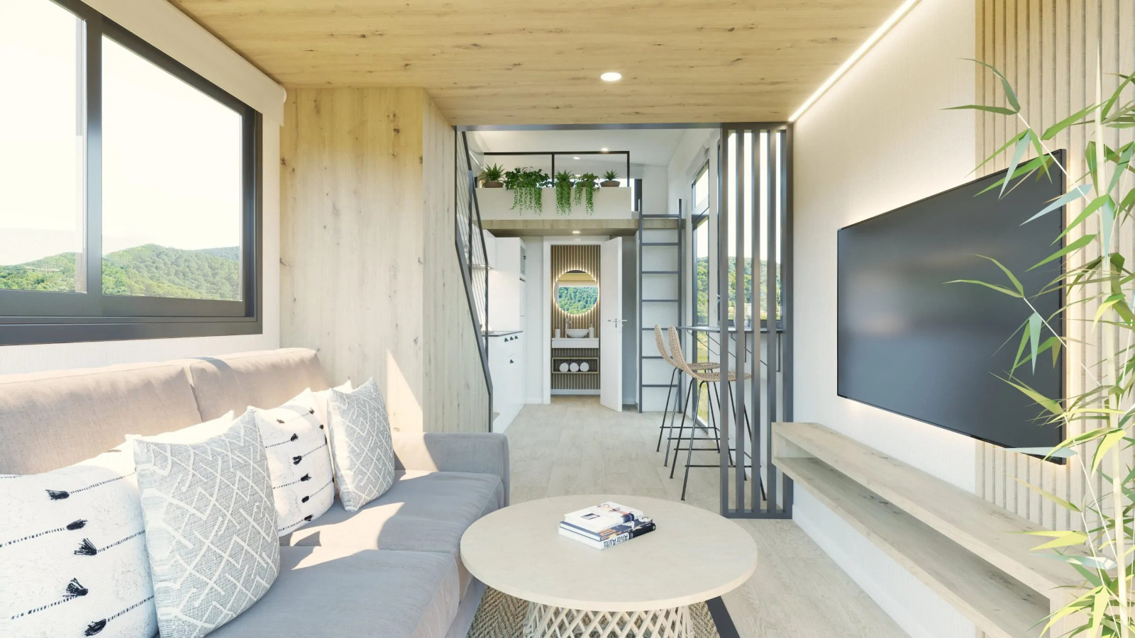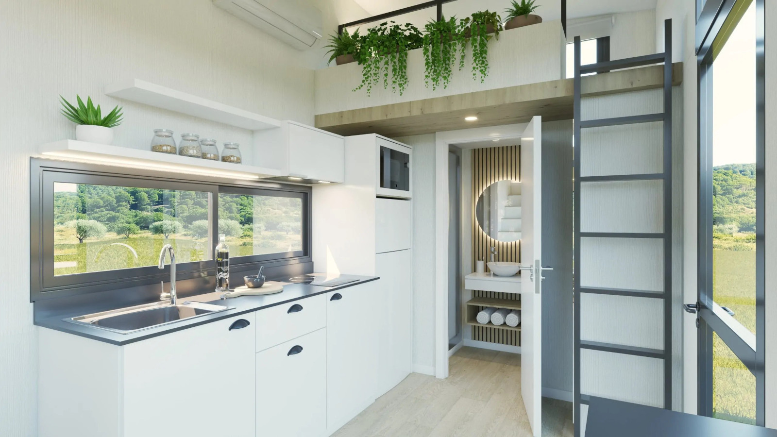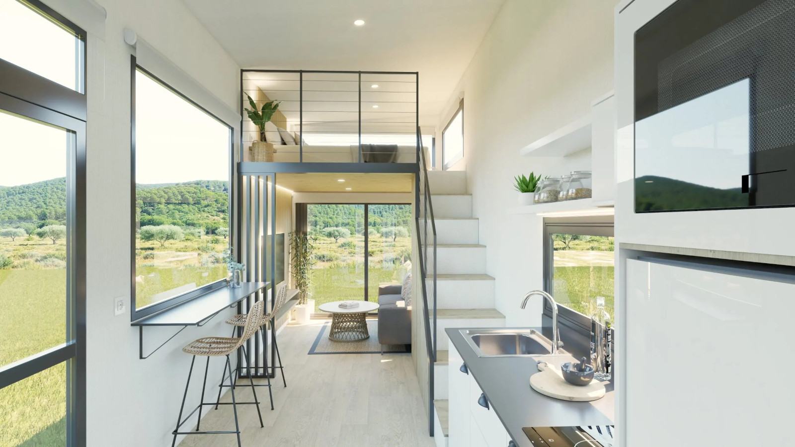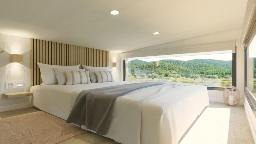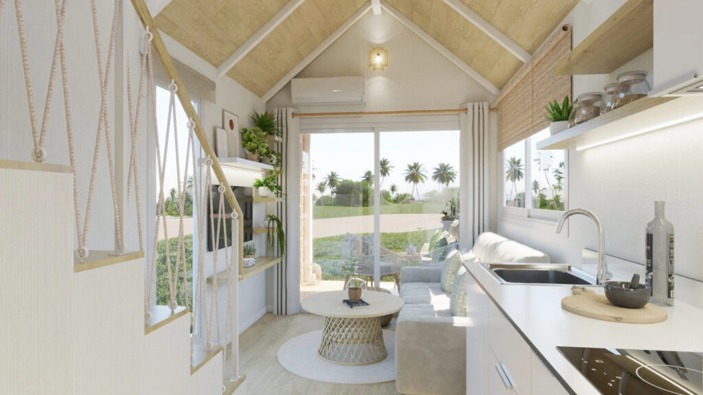 La Tiny Home Eira la veo más como un refugio con alma boho chic, donde cada rincón invita a relajarse. Nos la presentan con tonos blancos, maderas suaves y tejidos naturales que crean una atmósfera calmada y cálida. Con unas medidas de 7,80 x 2,44 x 3,95 metros, está pensada para 2 o 3 personas. Uno de sus grandes atractivos son sus grandes ventanales panorámicos, característicos del diseño de Alucasa, que llenan el interior de luz natural y conectan el espacio con el exterior a través de una terraza integrada de 180 cm. A la cocina no le falta de nada: está totalmente equipada y pensada para 2 o 3 personas. Y el baño incorpora una cabina de ducha con mampara y un bonito y estiloso lavabo. Para dormir nos ofrece un dormitorio principal con una cama de 135 x 190 con almacenaje y un sofácama. Lo que más me gusta es que dispone de una escalera «normal» para acceder al altillo.