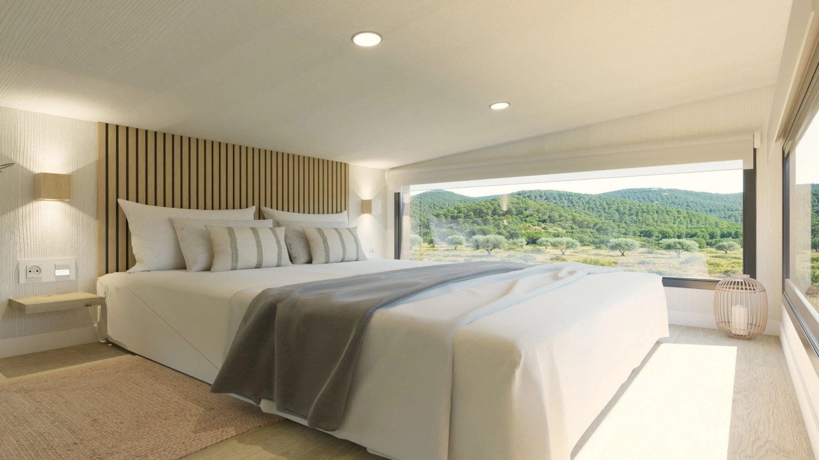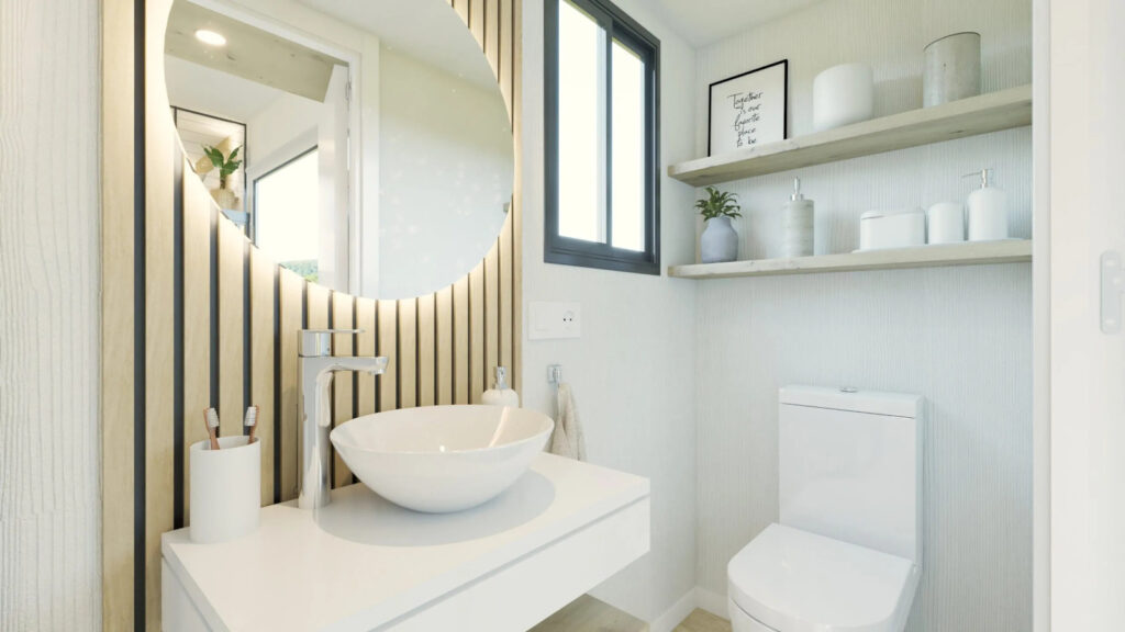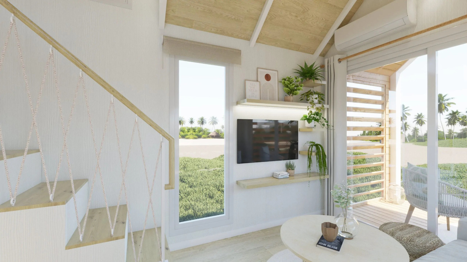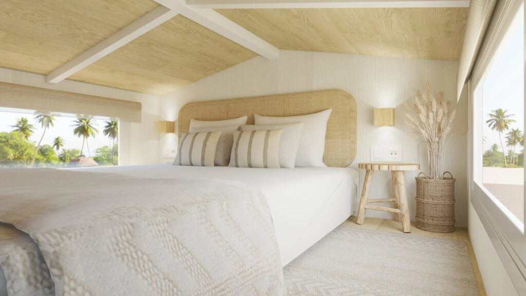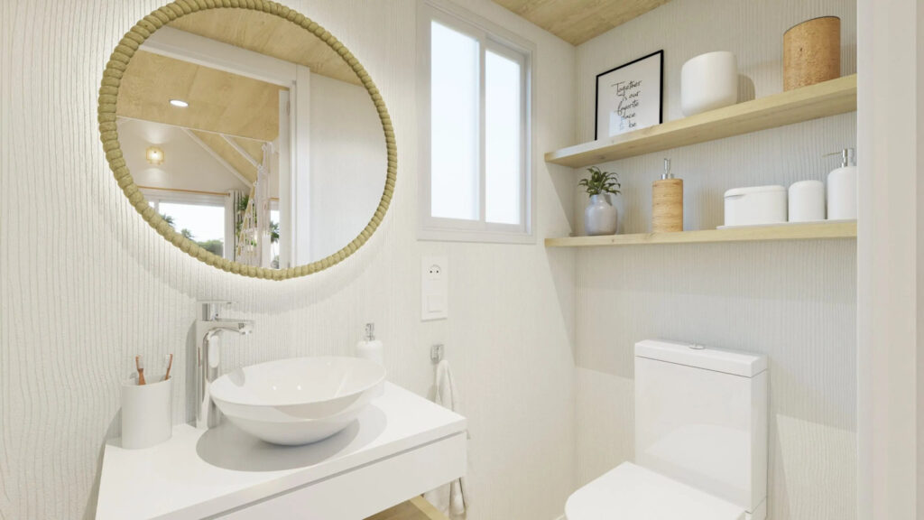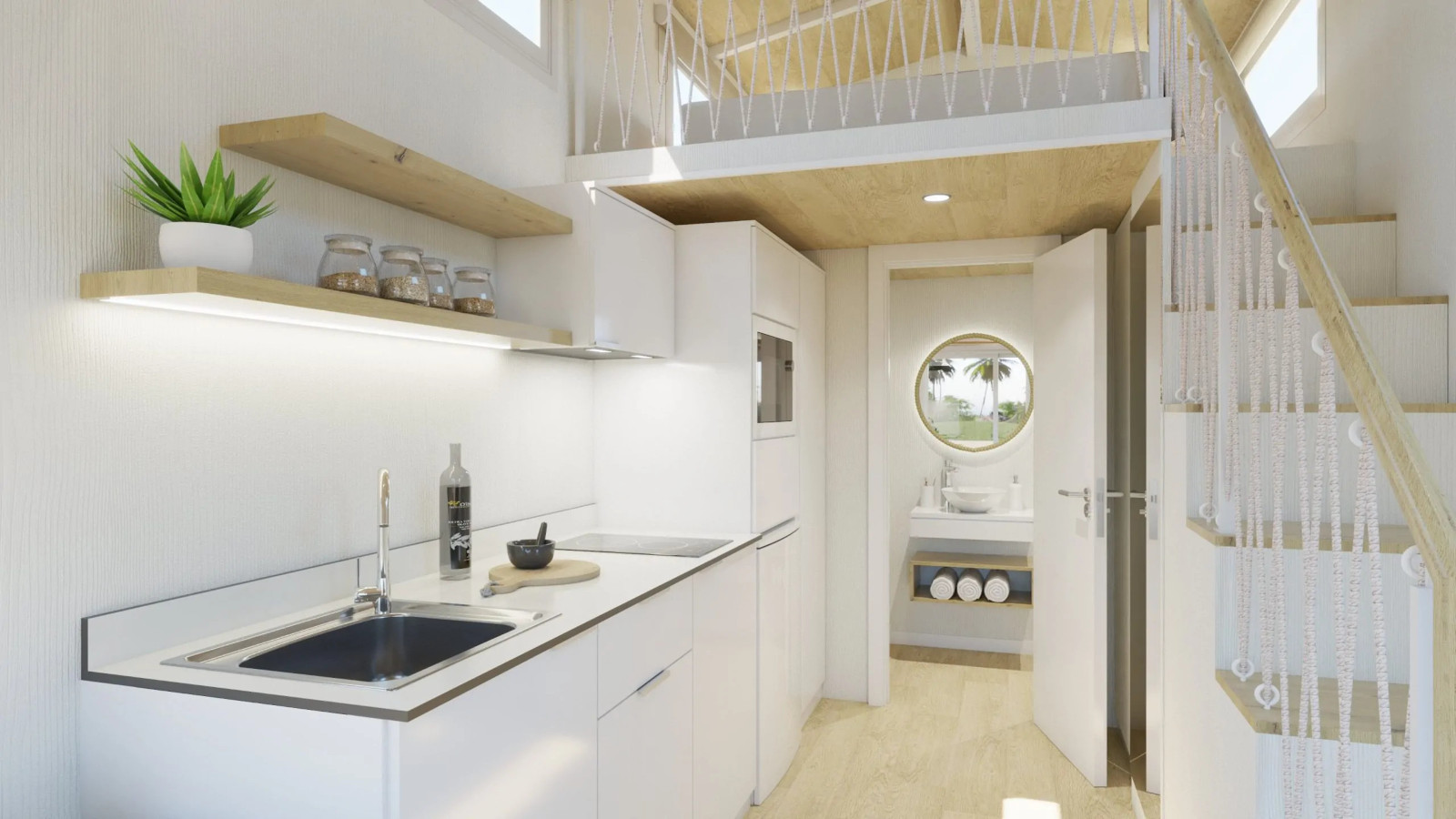 La Tiny Home Eira la veo más como un refugio con alma boho chic, donde cada rincón invita a relajarse. Nos la presentan con tonos blancos, maderas suaves y tejidos naturales que crean una atmósfera calmada y cálida. Con unas medidas de 7,80 x 2,44 x 3,95 metros, está pensada para 2 o 3 personas. Uno de sus grandes atractivos son sus grandes ventanales panorámicos, característicos del diseño de Alucasa, que llenan el interior de luz natural y conectan el espacio con el exterior a través de una terraza integrada de 180 cm. A la cocina no le falta de nada: está totalmente equipada y pensada para 2 o 3 personas. Y el baño incorpora una cabina de ducha con mampara y un bonito y estiloso lavabo. Para dormir nos ofrece un dormitorio principal con una cama de 135 x 190 con almacenaje y un sofácama. Lo que más me gusta es que dispone de una escalera «normal» para acceder al altillo.